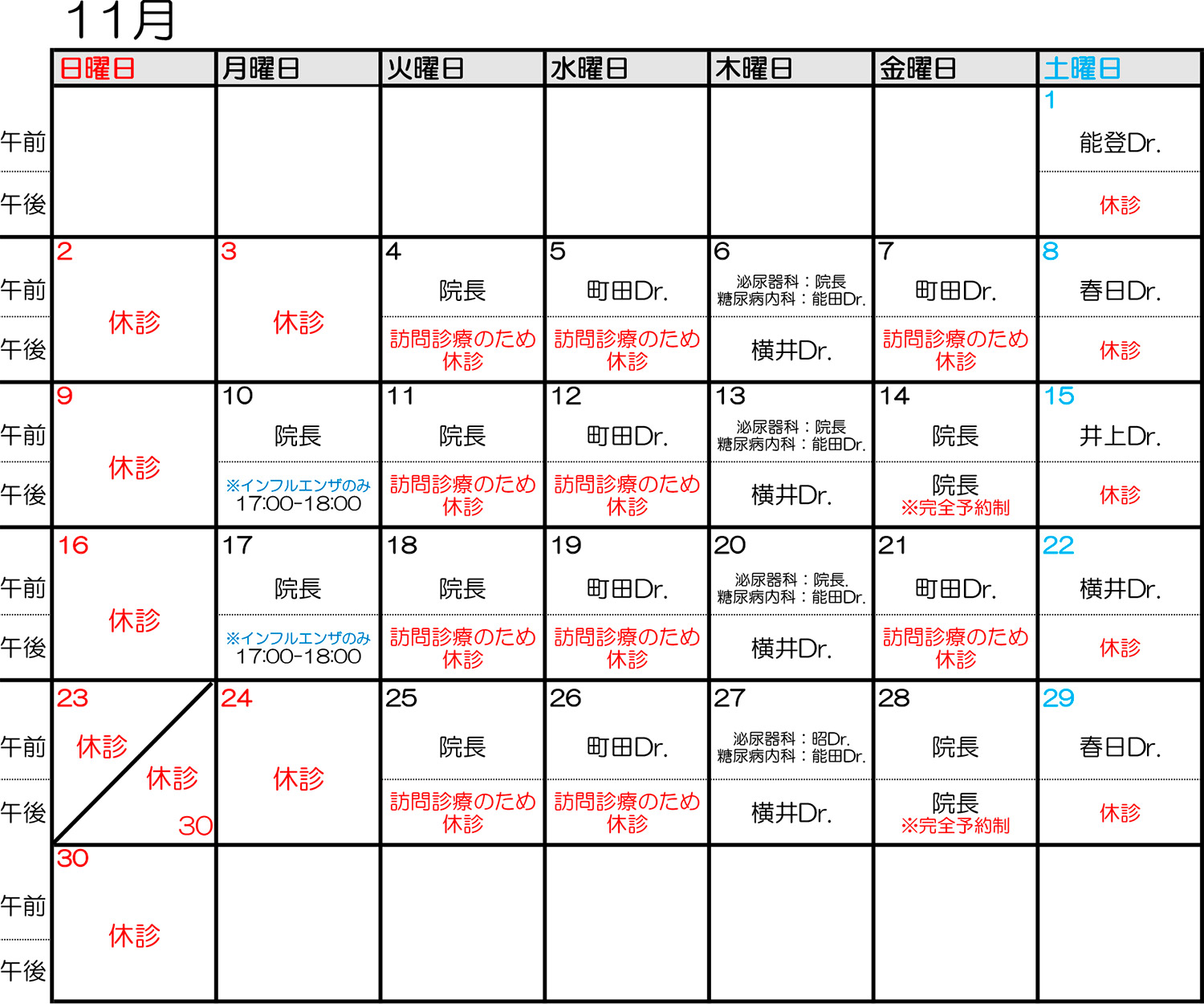11月10日(月) 午後→インフルエンザワクチン接種のみ 17:00~18:00